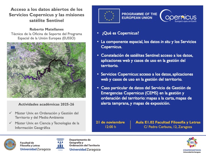 Dentro de las actividades académicas del curso 2025/2026 los másteres del Departamento, Máster Univ. en Ordenación y Gestión del Territorio y del Medio Ambiente y Máster Univ. en Ciencia y Tecnologías de la Información Geográfica, organizan la conferencia sobre "Acceso a los datos abiertos de los Servicios Copernicus y las misiones satélite Sentinel". El ponente será el Dr. Roberto Matellanes, Técnico de la Oficina de Soporte del Programa Espacial de la Unión Europea (EUSSO). Durante la conferencia se presentará el programa Copernicus de la Unión Europea y los servicios que presta en diversos ámbitos y en especial en el de la ordenación del territorio, centrados en la generación de cartografía a la carta y en otras aplicaciones.