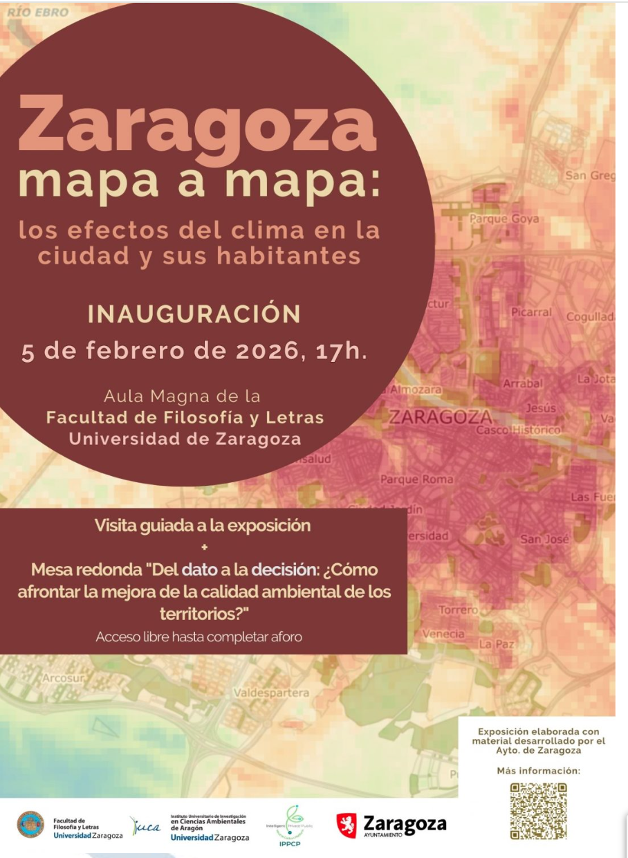 Investigadores de los grupos GEOT y Clima, Agua, Cambio Global y Recursos naturales del Departamento de Geografía, han colaborado para poner a punto la exposición " “Zaragoza, mapa a mapa. Los efectos del clima en la ciudad y sus habitantes” . La exposición pone en primer plano el valor del análisis geográfico para comprender la ciudad. A través de mapas y datos espaciales, la muestra invita a reflexionar —desde una mirada científica y social— sobre cómo el clima, la forma urbana y las desigualdades territoriales condicionan la salud, el confort térmico y la calidad de vida de la población.